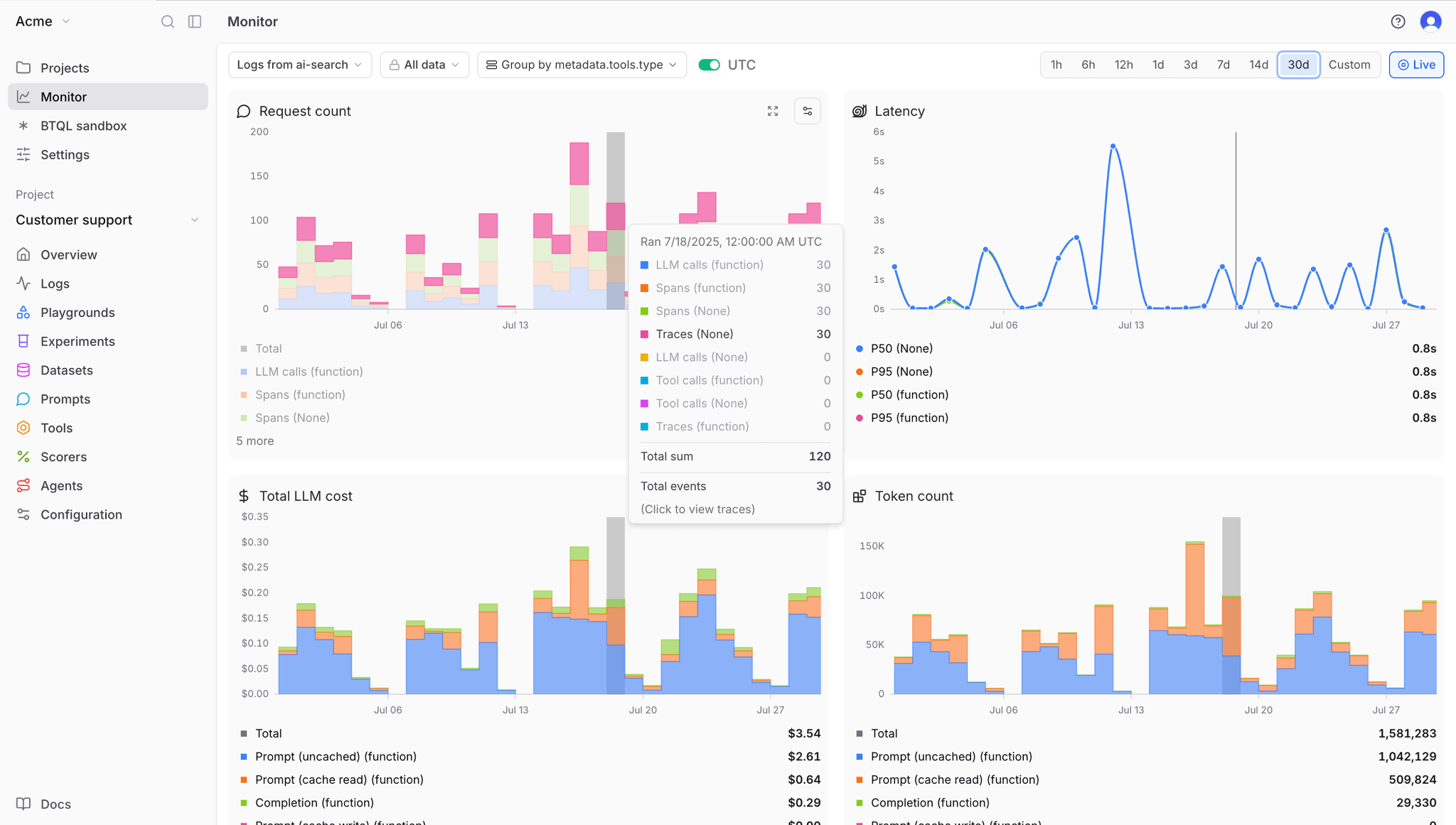 Braintrust captures comprehensive traces showing every decision point in multi-step workflows, which tools the agent called, what data it retrieved, how long each step took, and how much it cost. When quality degrades, you see exactly where the agent's reasoning went wrong rather than guessing from incomplete logs.